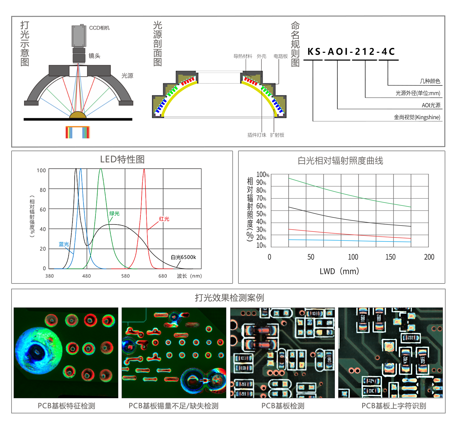 AOI系列光源采用紅綠藍(lán)三種顏色的高亮直插LED,分布成多種角度,并且可獨(dú)立控制,以達(dá)到在特定范圍內(nèi)實(shí)現(xiàn)顏色混合,能準(zhǔn)確反應(yīng)物體表面立體信息。