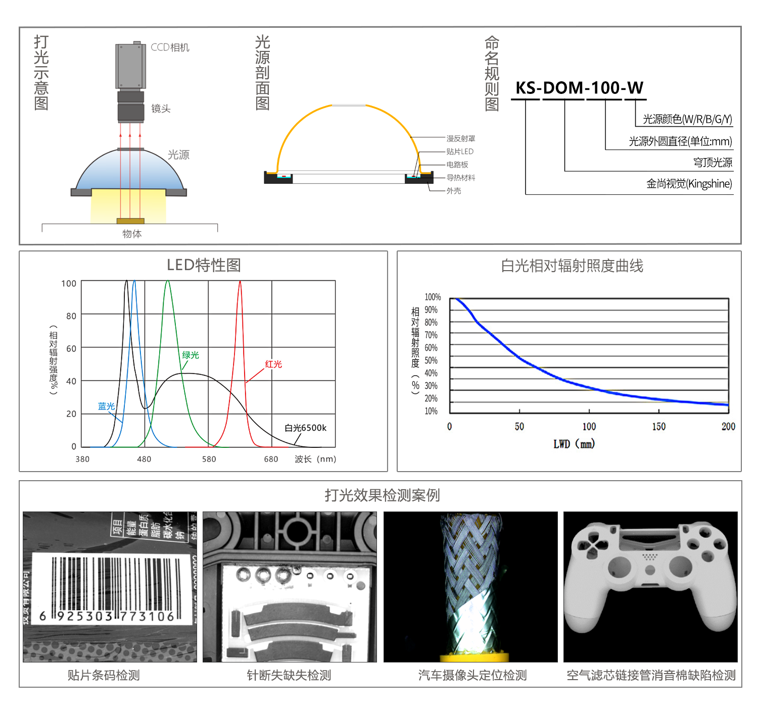 DOME系列碗光源,是由一圈高功率LRD往上照射,經(jīng)過穹頂高表面的納米涂層漫反射之后,全方位均勻地照射在被測物體表面,擁有較大的光擴散面。
